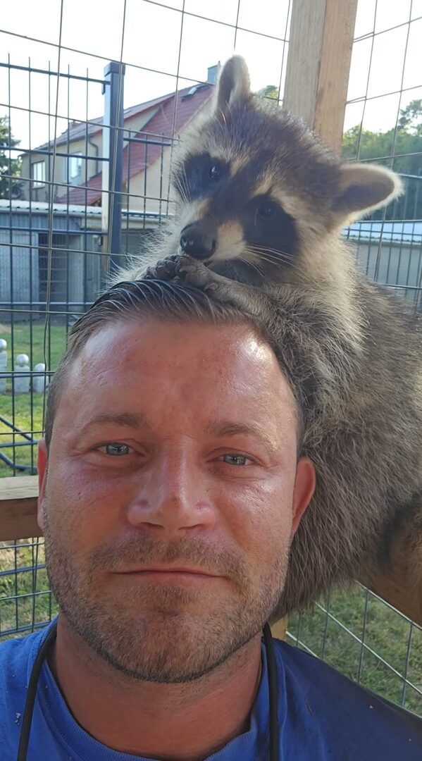 小さなアライグマでした! 撮影者さんの頭の上に乗っているのがかわいいアライグマ。