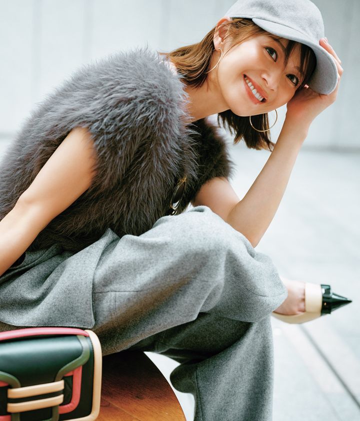 ニット¥19,800(アルアバイル)パンツ¥53,900(システム/アマン)バッグ¥182,600(ピエール アルディ/ピエール アルディ 東京)パンプス¥149,600(セルジオ ロッシ/セルジオ ロッシ カスタマーサービス)キャップ¥15,400(ラ メゾン ド リリス/エリオポール代官山)サングラス¥40,700(アイヴァン/アイヴァン 東京ギャラリー)ピアス¥31,900(マリハ)バングル¥55,000(メゾンヴァジック/ヴァジックジャパン)