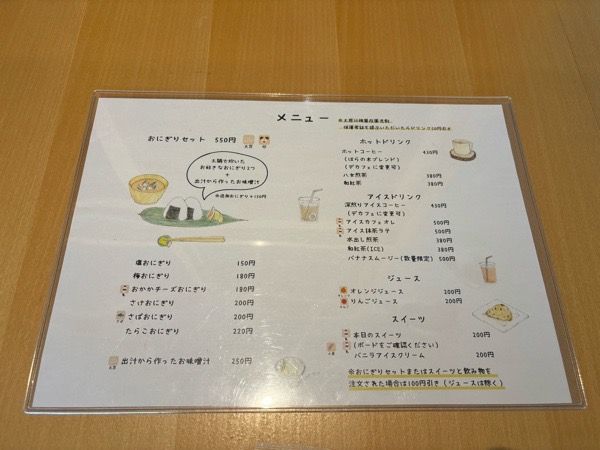 メニューはこちら。好きな具を選べるおにぎりセットをはじめ、地元の珈琲店に焙煎してもらったはらの木ブレンドやスイーツも充実しています。そしてデカフェに変更できるのも嬉しいポイント♪妊娠中や授乳中のママさんも安心してカフェを楽しめます。 今回はお昼時に伺ったので、おにぎりセットを注文しました。