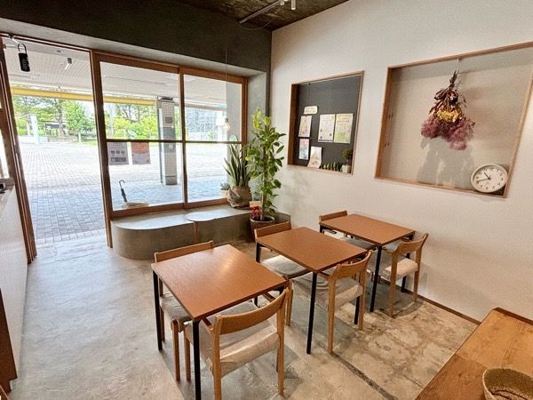 ベビーカーや車いすも入りやすいバリアフリーの入口。腰掛けられるベンチスペースも設けています。店内は明るく開放感があり、ナチュラルで優しい雰囲気です。座席は2人掛×4、4人掛け×1あります。