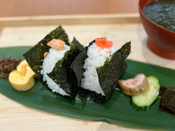 選べるお好きな具材のおにぎり二つと出汁からとったお味噌汁。具材はさけとたらこを選びました。おにぎりの横には、昆布、お漬物、卵焼き、ふりかけが添えられています。できるだけ福岡産のものを使用し、ふりかけはお味噌汁の出汁がらを使用しているそう。 土鍋で炊かれたご飯はふっくらとしていてお米の美味しさを感じます。お味噌汁は優しい味でアオサが入っていました。 海苔の香りも良く、添えられた副菜達が嬉しいです。食べながらほっこり満たされました♪ 全てのメニュー、テイクアウト可能で、お散歩ついでに、公園遊びの合間に、気軽に利用できます。