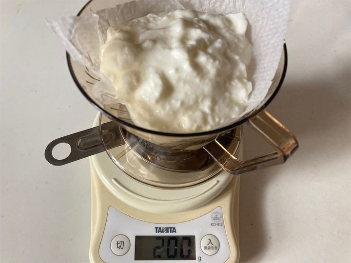水切りの方法は、ざるとキッチンペーパーを使っても出来ますが、コーヒードリッパーを使えばヨーグルト200g分をちょうどよく計ることが出来ます。