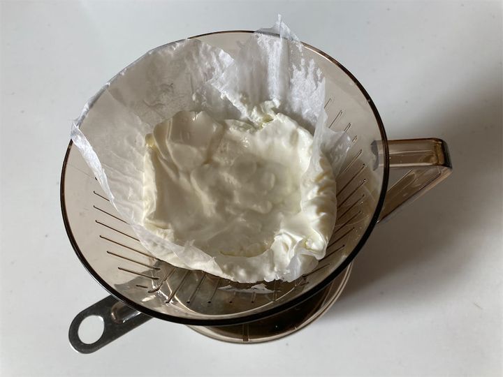 コーヒードリッパーにキッチンペーパーを敷き、受け皿としての計量カップをセットし、ヨーグルトを計り入れて1時間ほど冷蔵庫に置きます。