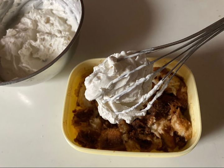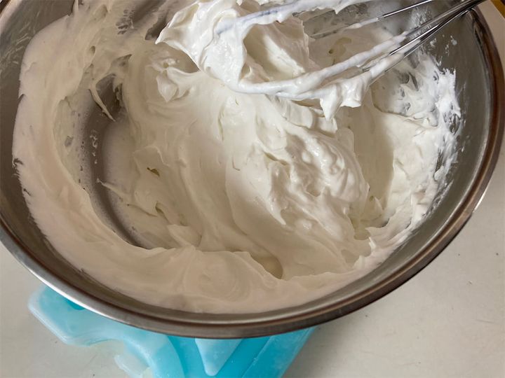 生クリームは、ツノが立つまで泡立てます。ボウルの底に保冷剤を置いて、冷やしながら泡立てると手動でも5分ほど頑張れば作れます。ほどよい腕のエクササイズにもなるので頑張って~!