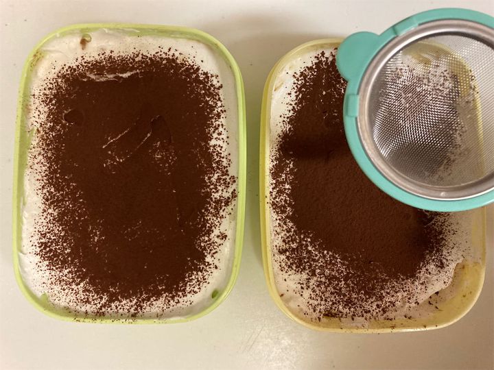 ココアパウダーをふりかけて「おうちティラミス」の完成です!