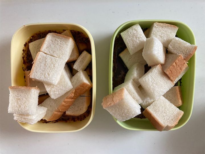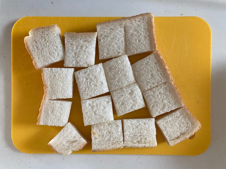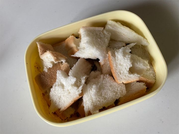 食パンは耳付きのまま、1枚を16等分に切り、容器に分けて入れます。