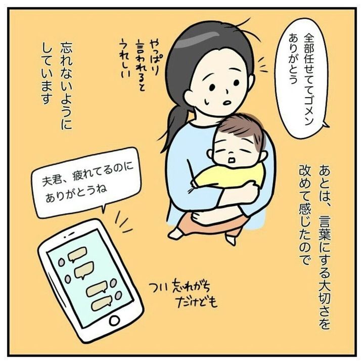 子育ての大変さも喜びも、共有できるようになったharumamaさん夫婦。「わかってくれる人がいる」というのは、心強いですね。さらに、感謝の気持ちも忘れないよう、伝えるようになりました。