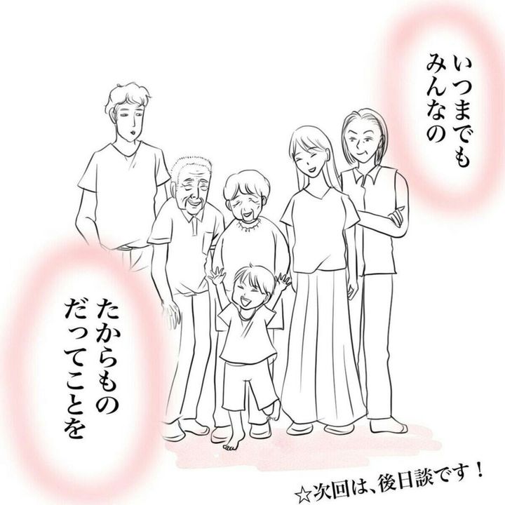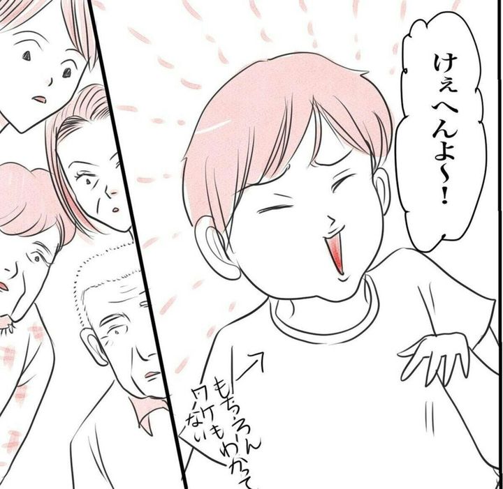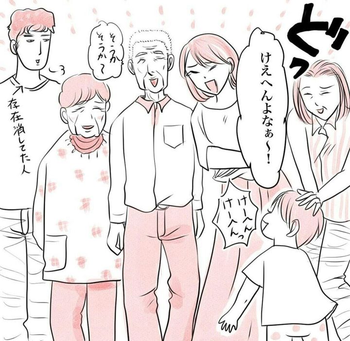 「元気に長生きしてくださいよということ」という言葉に、安堵(あんど)の表情を浮かべる祖父。そこで家族みんなで「お迎えはけーへん!」と背中を押します。そしてひ孫のそうくんも元気に「けーへん!」と祖父を励ましました。