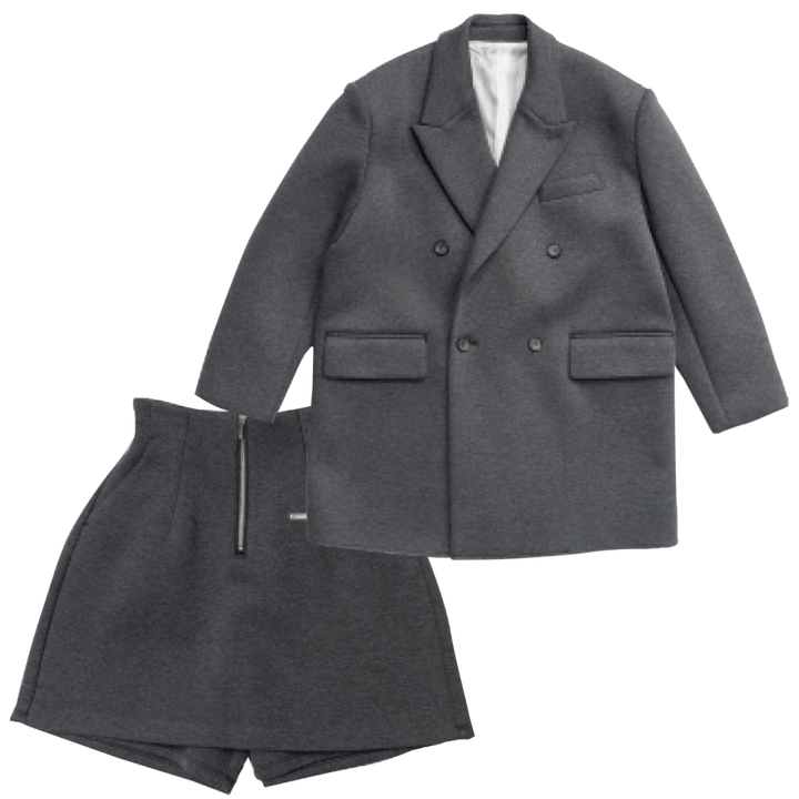 今季はボンディング素材も人気。ビッグJKとショートパンツのスーツは細めのヒール靴で女性らしく