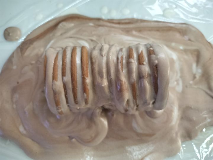 5. ビスケットに生クリームを乗せて土台の上に並べ、残った生クリームを表面全体に塗り、ラップでくるみ冷蔵庫で一晩冷やし固めます。