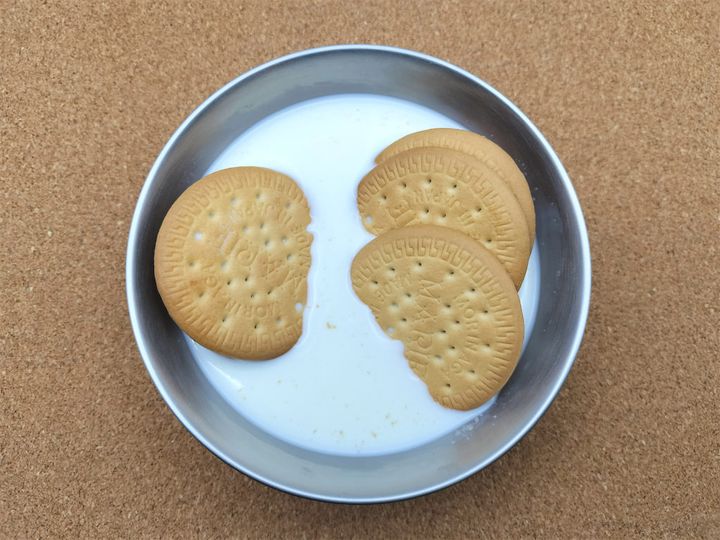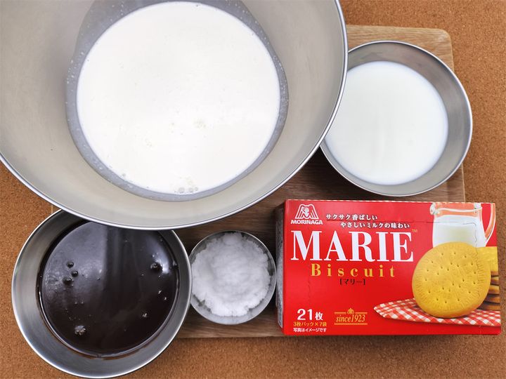 4. マリービスケットを牛乳にさっとくぐらせます。