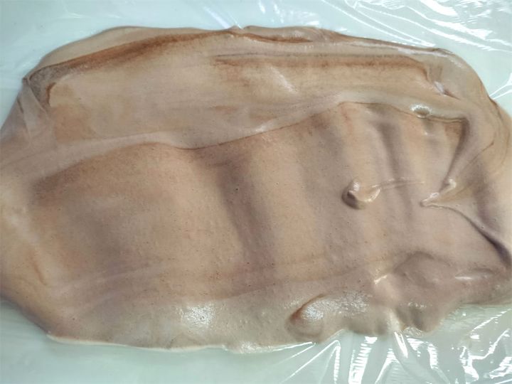 よく「角が立つまでホイップする」と言いますが、後からチョコシロップを加えるのでしっかりとホイップしました。しかも型に入れずにラップで巻くだけなので、チョコクリーム自体がしっかりしていないとドロドロに崩れてしまうことになります。ここはけっこう重要なポイントです。また作ってみるとわかりますが、クリームがかなり余ります。もう1本できるんじゃないの?というくらい余りますので、ケーキ作りに慣れている方は半量でもいいかもしれません。