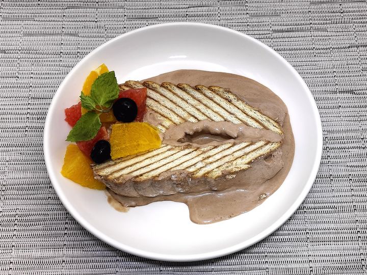 6. ラップをはがし、カットしてミントの葉とお好みのフルーツ(ともに分量外)と一緒に器に盛り付けて出来上がりです。