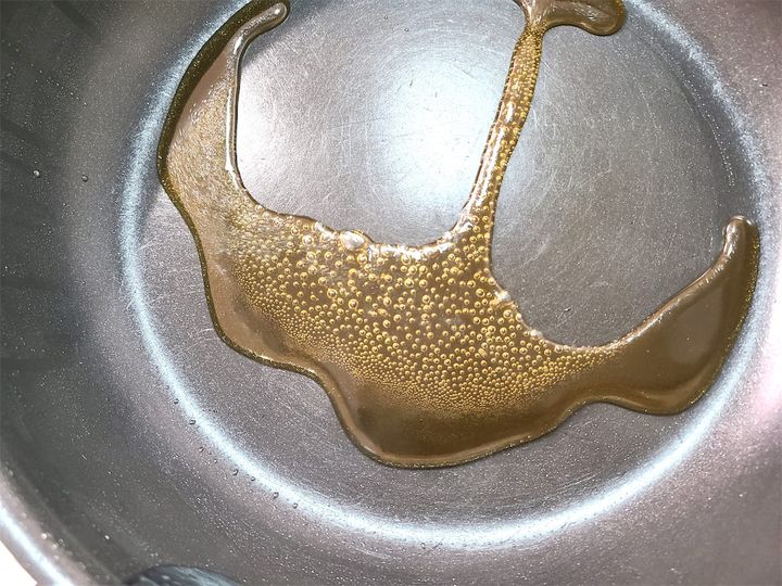 4. フライパンに砂糖と水(カラメル用)を加え弱火で熱し、砂糖が軽く焦げてカラメルになるまで加熱します。
