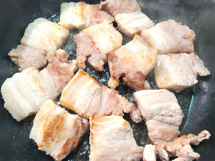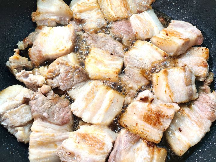 1. 豚肉を厚めに切ります。フライパンにサラダ油を引いて中火で熱し、豚肉を入れ、片面にこんがり焼き色が付くまで焼きます。片面にこんがり焼き色が付いたら、裏返して30秒ほどサッと焼いて一度取り出します。