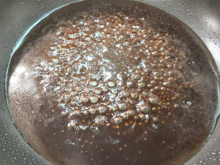 5. 3を加え、カラメルを調味液に溶かすように混ぜ合わせたら、とろみが付き香ばしい香りが立つまで煮詰めます。