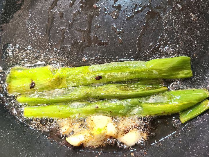 2. 豚肉を焼いて脂が残ったフライパンに、潰したにんにくと長ねぎの青い部分を加えたら、両方こんがり焼き色が付くまで弱火でじっくり香り出しをして香味油を作ります。