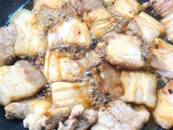 ●タレを一度煮詰めて軽く焦がし、再びお水を加えて豚肉と共に煮詰めることで香ばしい香りと奥深さが増す