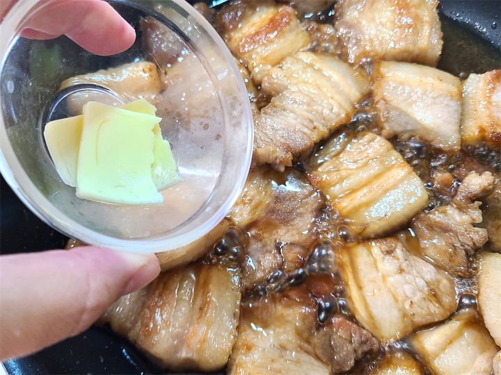 6. タレが煮詰まり香ばしい香りが立ったら、水と1の豚肉を加えタレに軽くとろみが付くまで弱火で煮詰めます。