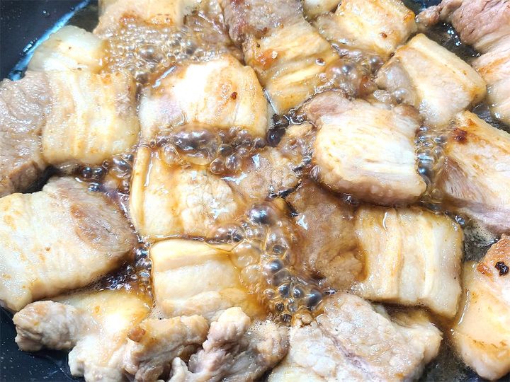 ●豚肉にしっかり焼き色を付けることで、こんがり焼けた香ばしい香りを引き出すことができる