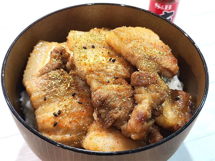 7. タレが煮詰まれば最後にお好みでバターを加えて絡め、ご飯の上に盛り付けたら完成です♪お好みで七味唐辛子や山椒をかけて食べましょう!