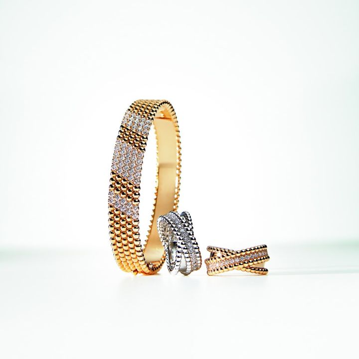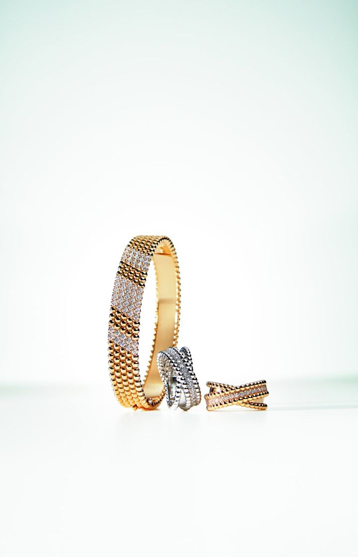 ペルレ ダイヤモンド ブレスレット、5連[K18YG×DIA]¥4,936,800、同 ダイヤモンド デュオ リング[K18WG×DIA]¥1,557,600、同 ダイヤモンド デュオ リング[K18YG×DIA]¥1,465,200(全てヴァン クリーフ&アーペル ル デスク)