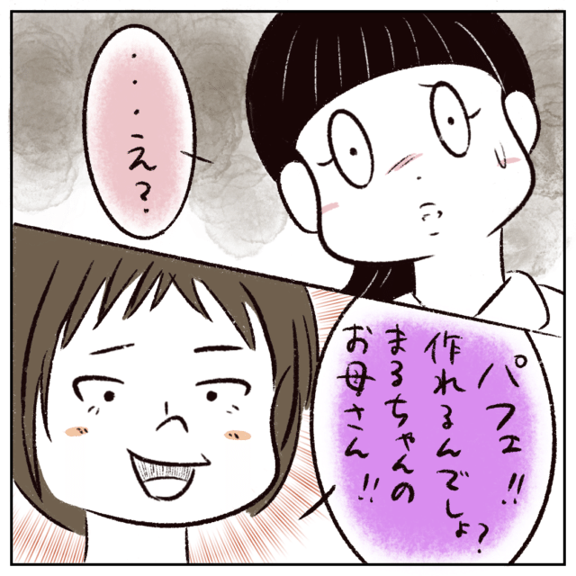 「・・・え?」予想外の質問に戸惑うまるさんに、さなかちゃんは「パフェ!!作れるんでしょ?まるちゃんのお母さん!!」と前のめり。