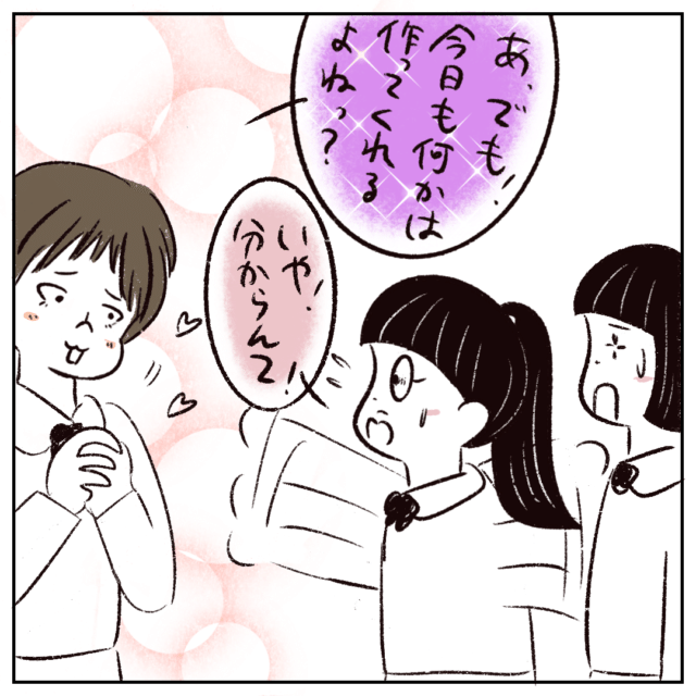これで諦めたかと思いきや「あ、でも!今日も何かは作ってくれるよねっ?」と目を輝かせるさなかちゃんに「いや!分からんて!」と焦るまるさん。