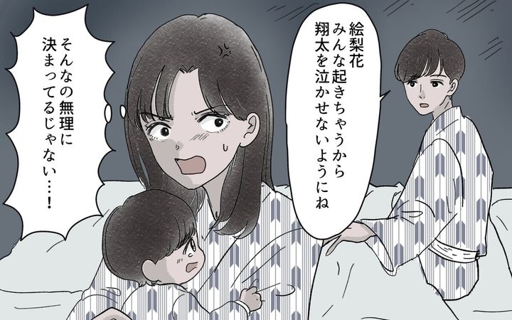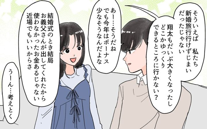 ・授乳もあるしそもそも赤ちゃんいるのに別々の部屋しないなんて、それでいて赤ちゃん泣かせないで……無理でしょ。料理が楽しみって…いやいや息子嫁完璧アウェイでしょ。息子夫婦の新婚旅行に勝手に便乗する義父母、反対もしない旦那、おかしすぎる。