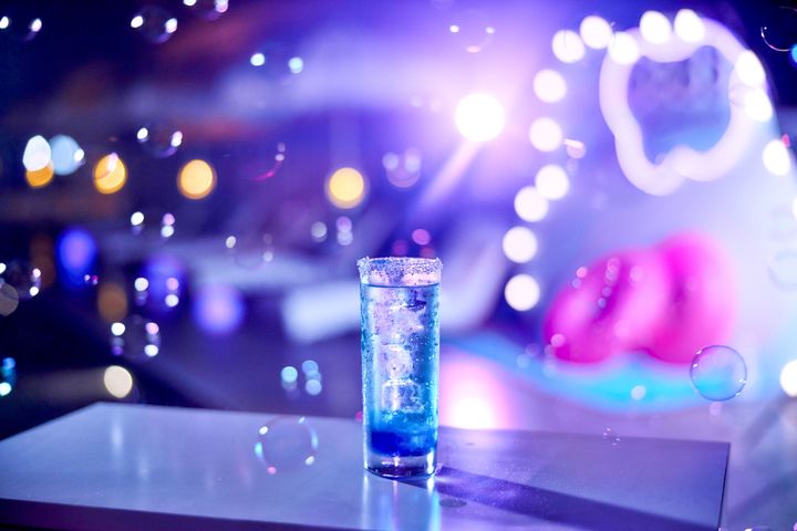 17~23時には、プールエリアをグラスの中におさめたような色合いの「キラキラモクテル」800円も販売されます。ブルーキュラソーのブルーとシークヮーサーのイエローが層になっていて、キラキラのチョコレートをトッピング。飲むときによくかき混ぜると、炭酸ベースでさっぱりしたオリジナルドリンクに。グラスの中で混ざっていく様子は、動画におさめたくなること間違いなし!