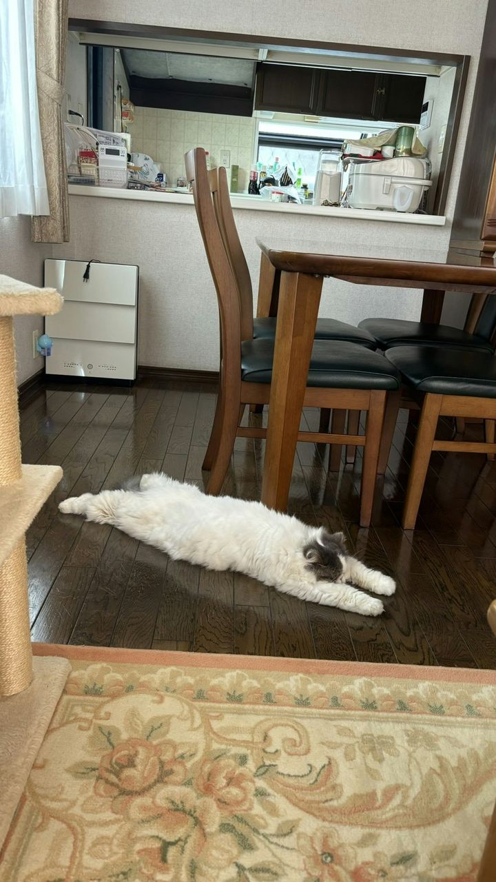 ふわふわとした毛が特徴的なひらめちゃん。寒い季節には暖かそうですが、暑い日はかなり暑そうに見えますね。そんなひらめちゃんが行き倒れていたのはフローリングの上。カーペットではなく、フローリングのひんやり感が気持ちいいのでしょうか。手足をピーンと伸ばしている様子がかわいすぎますね。
