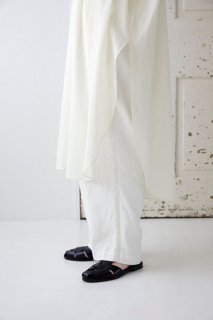 チュニックの深めのスリットが、軽やかな抜け感を演出。リネンパンツを合わせたオールホワイトのレイヤードスタイルに奥行きもプラスしてくれます。足元はブラックのグルカサンダルで着こなしを引き締め、スタイリッシュな印象に。
