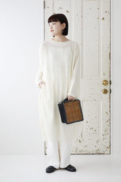 ガーゼロングチュニックにリネンパンツを合わせ、自然素材の風合いを活かしたリラックス感漂うオールホワイトの着こなし。さりげない透け感と、白のトーンに変化をつけて、好バランスな着こなしに仕上げています。