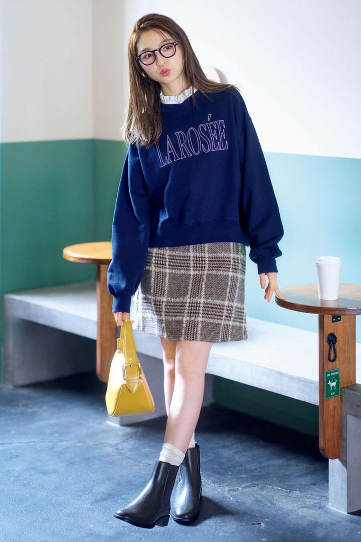 スカート¥19,800/イチエ(シュガー・マトリックス) プルオーバー¥5,480/オペーク ドット クリップ ブラウス¥5,990/クチュール ブローチ(ワールド プレスインフォメーション) 眼鏡¥17,600/ランバン オン ブルー(デリーゴジャパン) イヤリング¥6,600/カリーヌサルタン(ココシュニック 新宿タカシマヤ店) バッグ¥148,500/J&M デヴィッドソン(J&M デヴィッドソン カスタマーセンター) 靴下¥1,650/17°C(17°C by Blondoll 横浜ジョイナス店) 靴¥37,400/銀座かねまつ(銀座かねまつ6丁目本店)