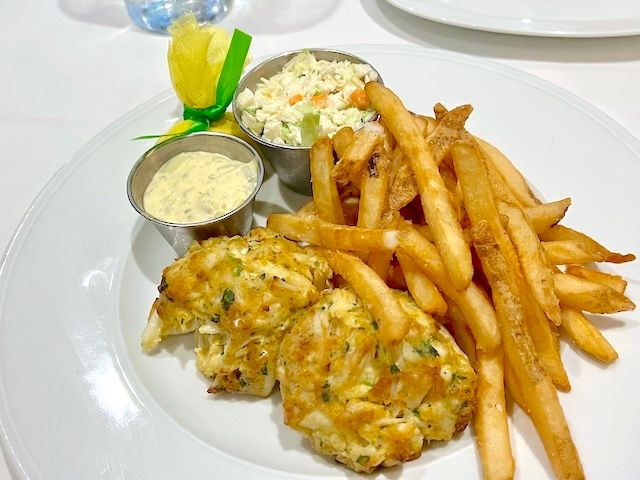 おいしいと評判のクラブケーキを早速注文。メニュー名は、「ジャンボランプクラブケーキ」です。サイドディッシュは、フライドポテト、コールスロー、タルタルソース、レモンまたはコーン&トマトが添えられています。