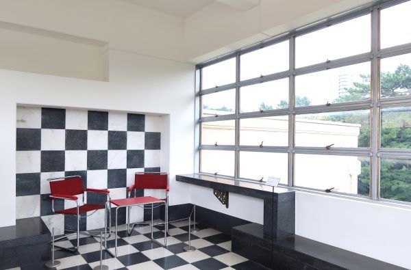 日当たりのよい室内は、市松模様のモダンな内装に当時のスチールパイプ家具が復刻して展示されていました。