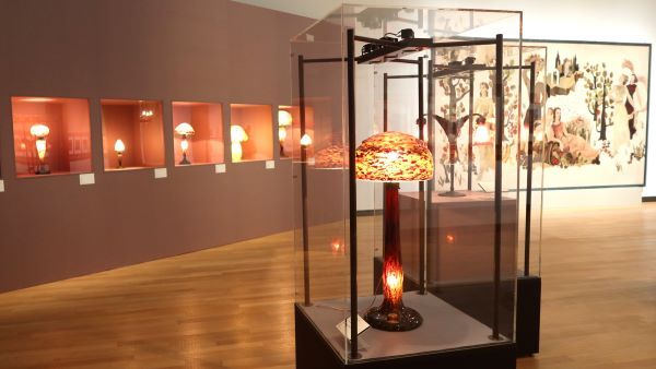 新館ギャラリーでは、ルネ・ラリック、レイモン・シュブ、エミール・ガレなど1920年~30年代のアール・デコ期に活躍したデザイナーの照明器具あかりをともして展示されていました。