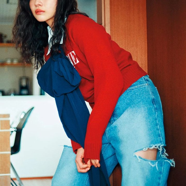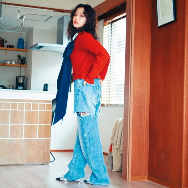 ブルーサイドカットデニムパンツ 9,690円/NADIA FLORES EN EL CORAZON 赤ロゴニット 9,890円/épine 白シャツ 3,289円/スピンズ ネイビービッグリボンチョーカー 5,940円/J1U by LA BELLE ETUDE(アンティローザ) パンプス 9,900円/チャールズ&キース(チャールズ&キース ジャパン)