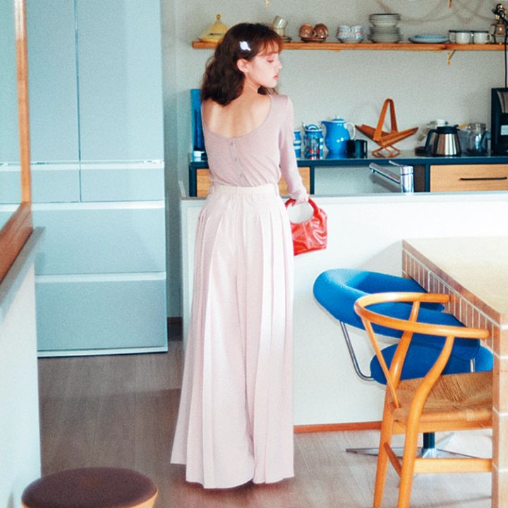 ピンクバックオープンニット 6,930円、ピンクプリーツワイドパンツ 13,200円/ともにrienda(バロックジャパンリミテッド) ヘアクリップ(2個セット)2,090円/GOLDY バッグ 11,400円/ヨミム(HANA)