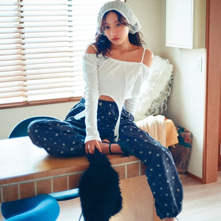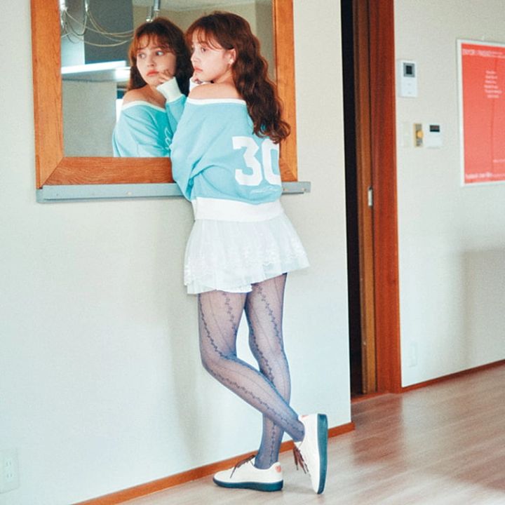 水色オフショルスエット 9,790円/atomos pink×FUBU(アトモス ピンク フラッグシップ 原宿)白レーススカートパンツ 15,315円/マーガリンフィンガーズ(スクリーンショット) イヤリング 330円/ラティス レースタイツ 1,100円/靴下屋(Tabio)スニーカー 13,200円/プーマ