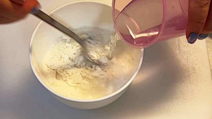 (ボウルに)片栗粉、米粉、塩を入れまして、水で溶いたら基礎になる生地のできあがりでございます。