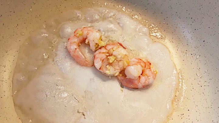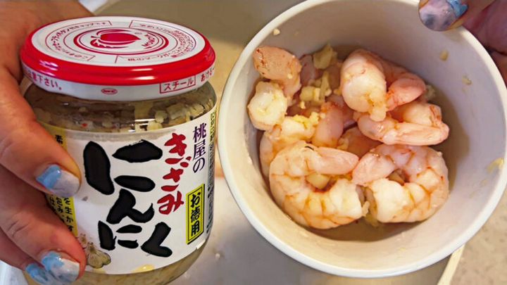 このエビはですね、あらかじめガーリックオイルで炒めております。