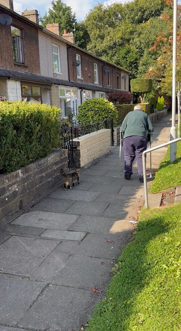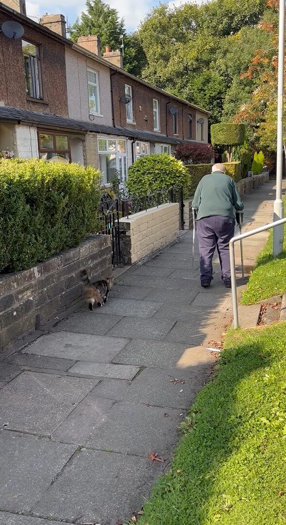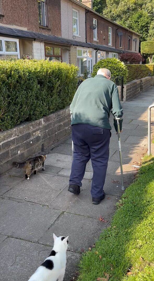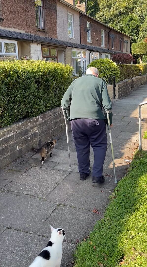 動画が撮影されたのは、イギリス。 おじいちゃんと一緒におさんぽするネコの様子が捉えられています。
