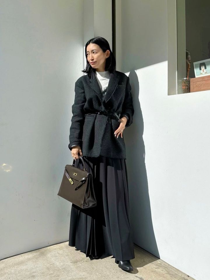 「トラッドなテーラードジャケットを主役に、他を少しモードなアイテムでまとめて大人に仕上げたレディなスタイル。ウエストマークをすることでメリハリをつけ、ミニマルな身長をカバー。小物を含めて色味を極力抑えることでまとまりをつけました」