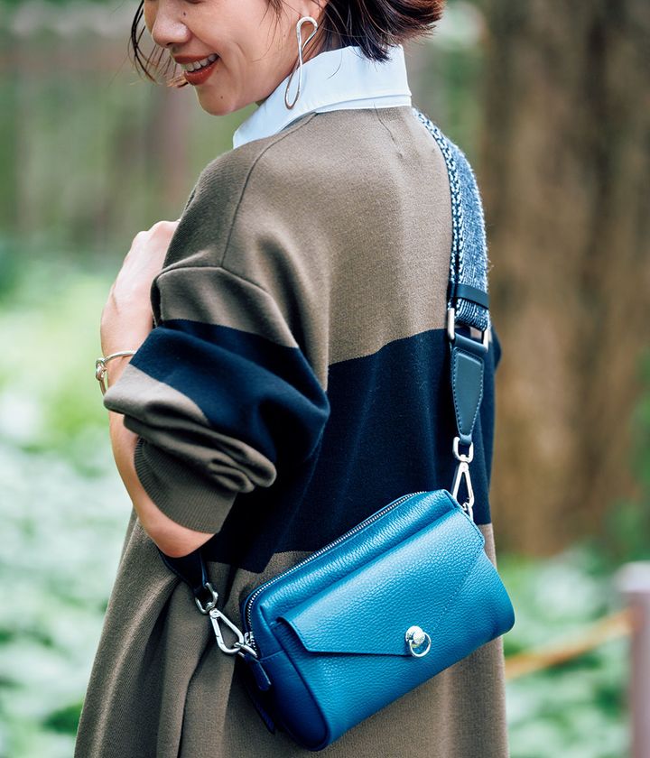 スポーツ行事の日は特に、両手が空くクロスボディバッグがマスト。 ただし、素材はレザーをチョイス。 付け替えできるカジュアルな ストラップにも注目しています。 (潮田玲子さん)