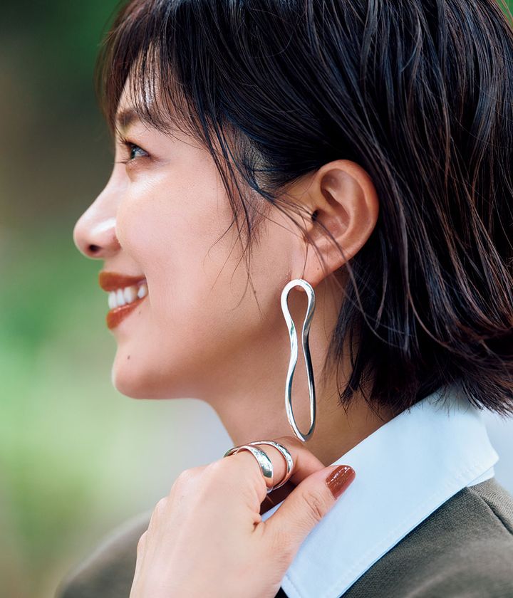 アクセサリーはカジュアルな日も普段と変わらず、女らしさをプラスできるものを選びます。シルバーの大振りピアスならコーデのアクセントに最適。