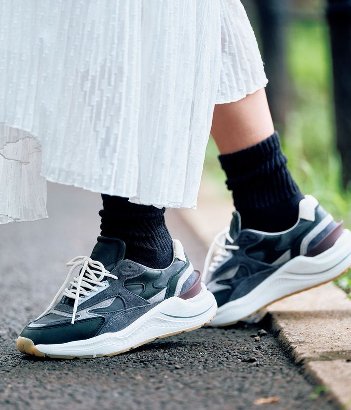 ローテクすぎず、ハイテクすぎないD.A.T.E.は品もあってやっぱり優秀! ソックスはスニーカーの色を拾うと失敗しません。 厚手のリブがスポーティで◎ (潮田玲子さん)