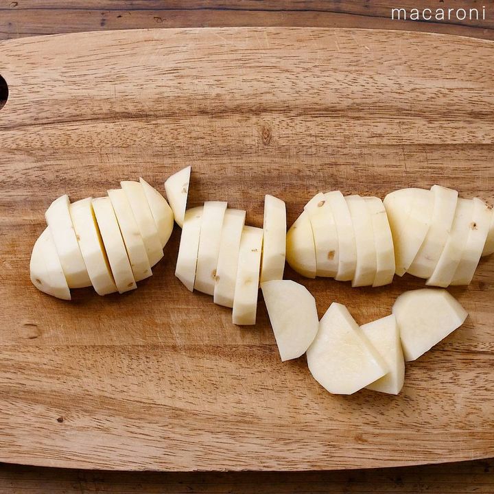1: じゃがいもは皮をむいて1cm幅の半月切りにします。