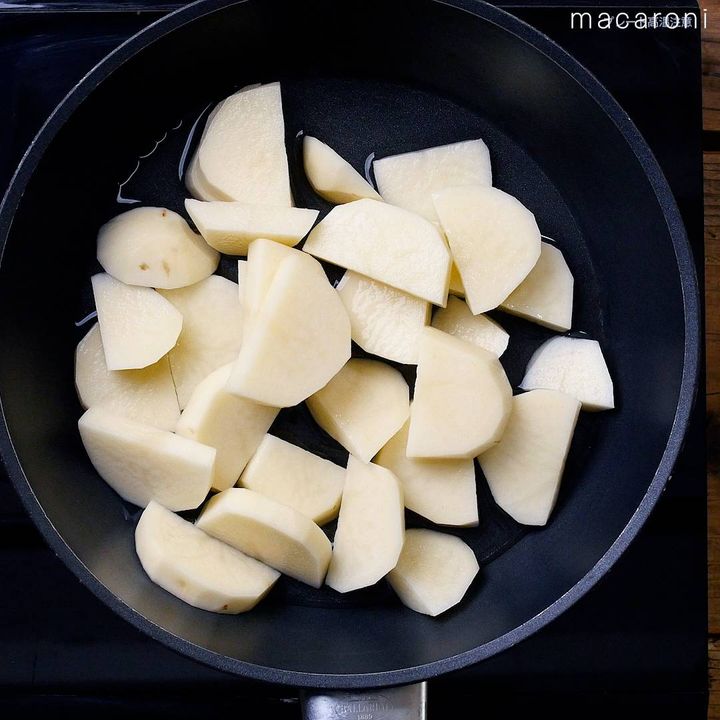 じゃがいもを蒸し煮にする際、水分がなくなって焦げつきそうになったら少しずつ水を足してください。じゃがいもが完全にやわらかくなったらOKです。
