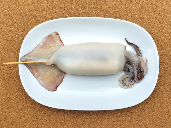 2. イカの中にきゅうりと山いもを縦に詰め、ゲソでフタをするように頭からゲソまでを串で刺します。